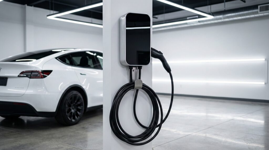 Tesla Universal Wall Connector (UWC): This is the “Swiss Army Knife” of chargers. It has a built-in adapter that lets it charge both NACS (Tesla) and J1772 cars natively. It’s excellent if you have a mixed-brand EV garage. Check on Amazon.
